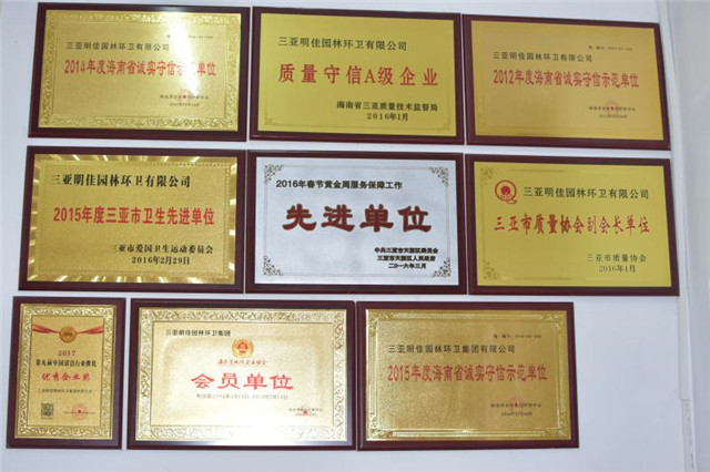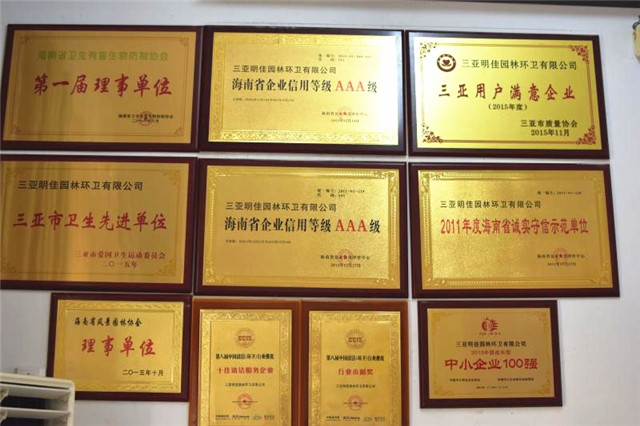 目前母公司連續(xù)五年被海南省企業(yè)信用評定中心評定為信用AAA等級單位,并榮獲中國清潔清洗行業(yè)國家一級資質、城市環(huán)境衛(wèi)生經營服務A級資質、城市園林綠化三級資質,被中國清潔行業(yè)推選為國家三星級企業(yè)、十佳清潔服務企業(yè)、杰出貢獻企業(yè),并榮獲2016年中國清潔行業(yè)百強品牌,成為中國清潔行業(yè)常務理事單位、中國衛(wèi)生有害生物防制協(xié)會會員單位、中國城市環(huán)境衛(wèi)生協(xié)會會員單位、海南省衛(wèi)生協(xié)會理事單位、三亞市環(huán)境保護協(xié)會副會長單位,公司先后多次獲得國家、省、市獎勵和表彰40余次,成功在海南省股權交易中心掛牌,代碼:90777,并積極籌劃在新三板上市,已真正成為海南省環(huán)衛(wèi)行業(yè)的龍頭企業(yè)。